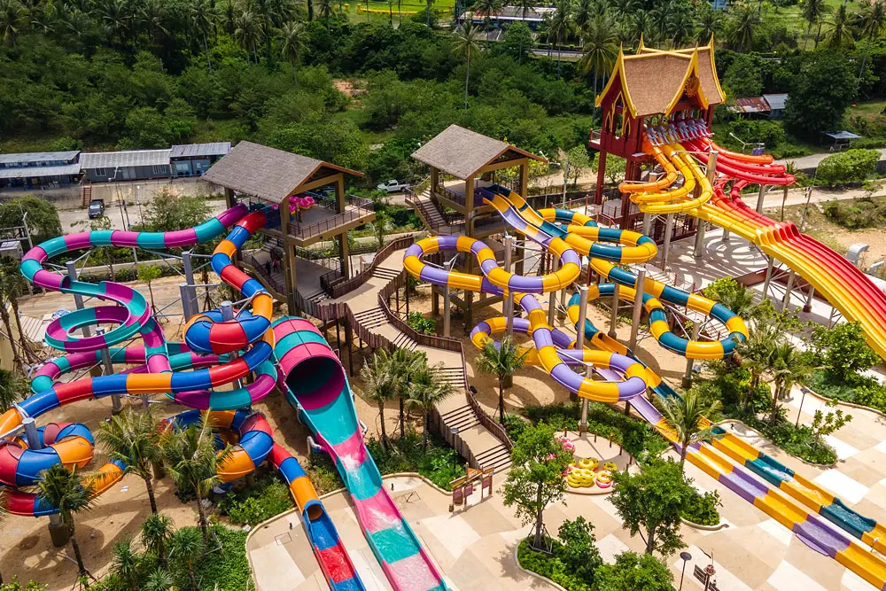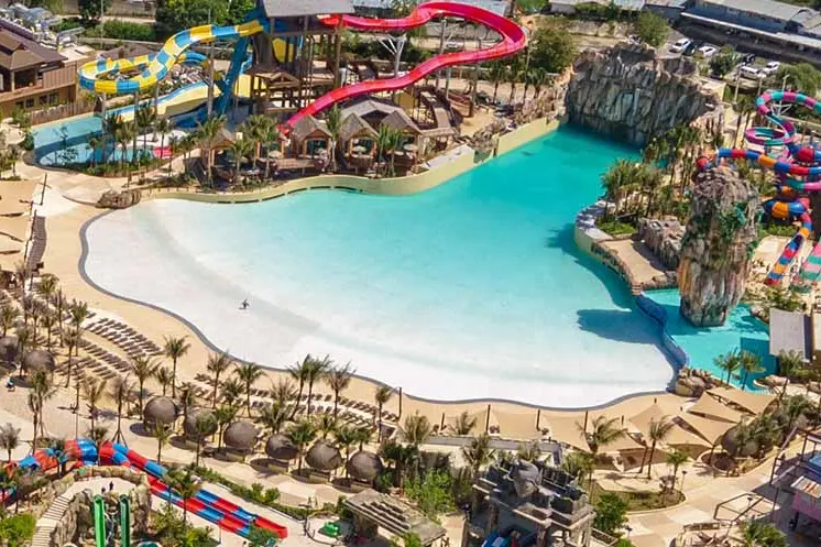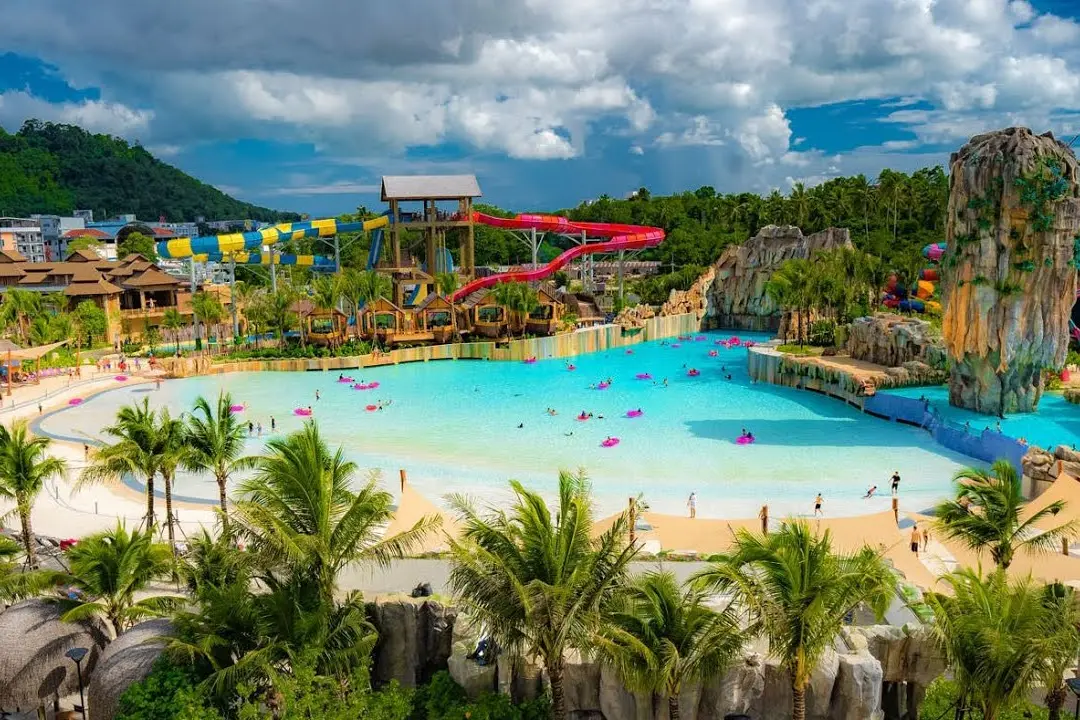 Facilities include a children’s zone, bridges, waterfalls, wave pool, floating market, restaurants, bars, and shops.