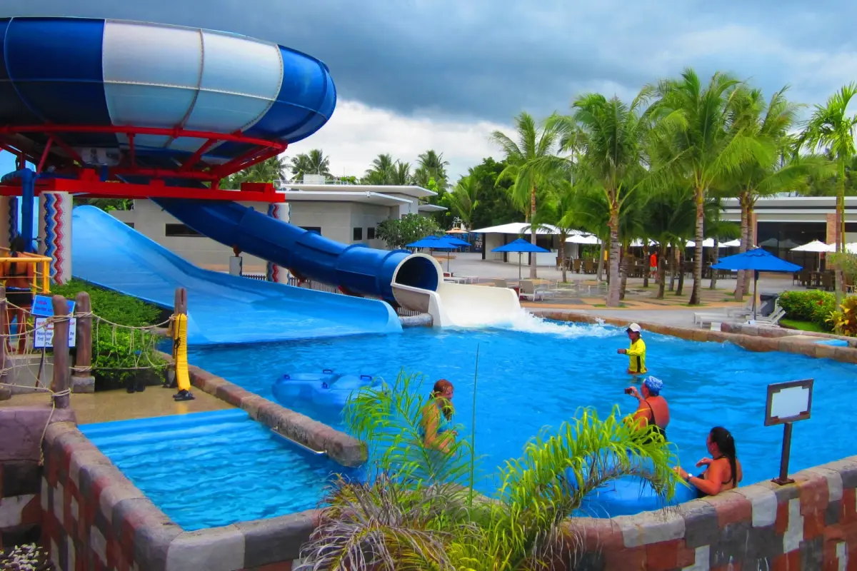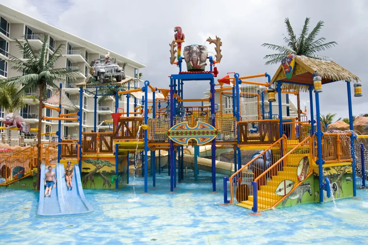 A dedicated children's area features water slides and a pool.
