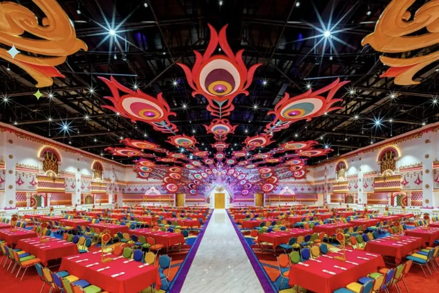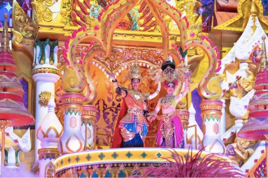 Outdoor "Festival of Colors" parade with performers, lively shows, and dancing.