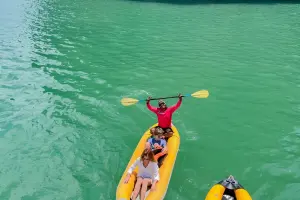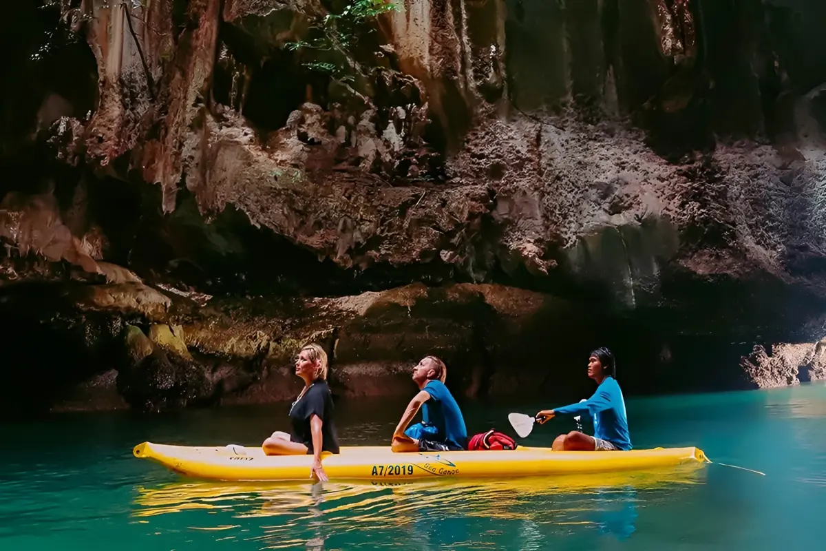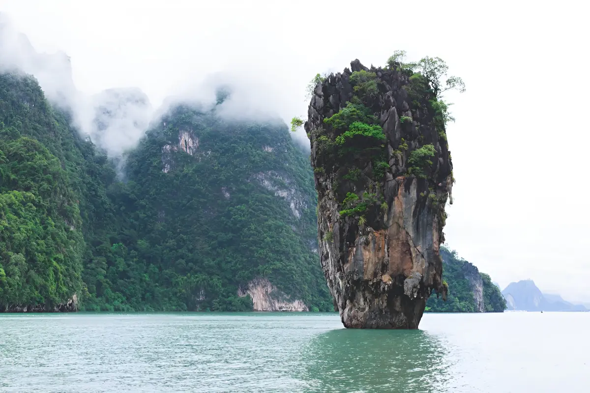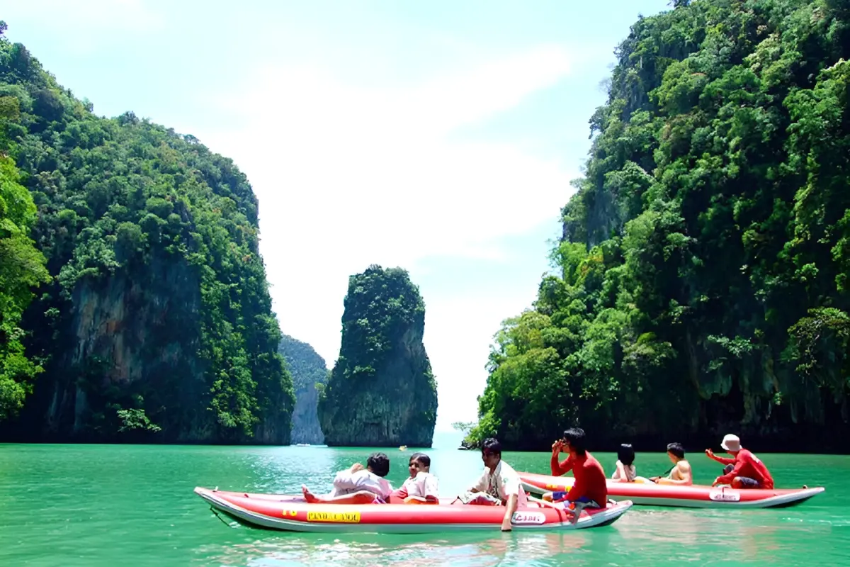 Sea tour around Phang Nga Bay islands: Panak, Talu, James Bond, Naka, and the floating village of Panyee. Canoeing through mangrove forests, caves, limestone cliffs, lunch in a village, beach relaxation and swimming.