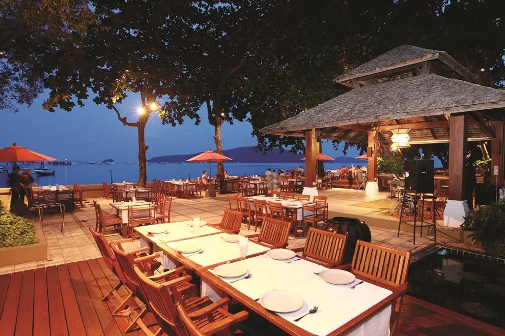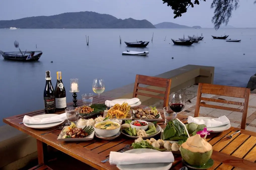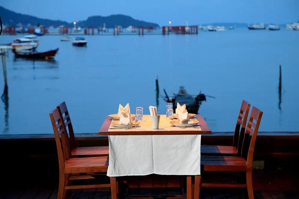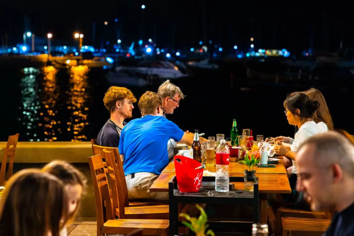The restaurant offers a stunning panoramic view of the bay, nearby islands, and docked boats, with the soft sound of the waves and gentle live music in the background - perfect for romantic couples, business partners, or family celebrations.