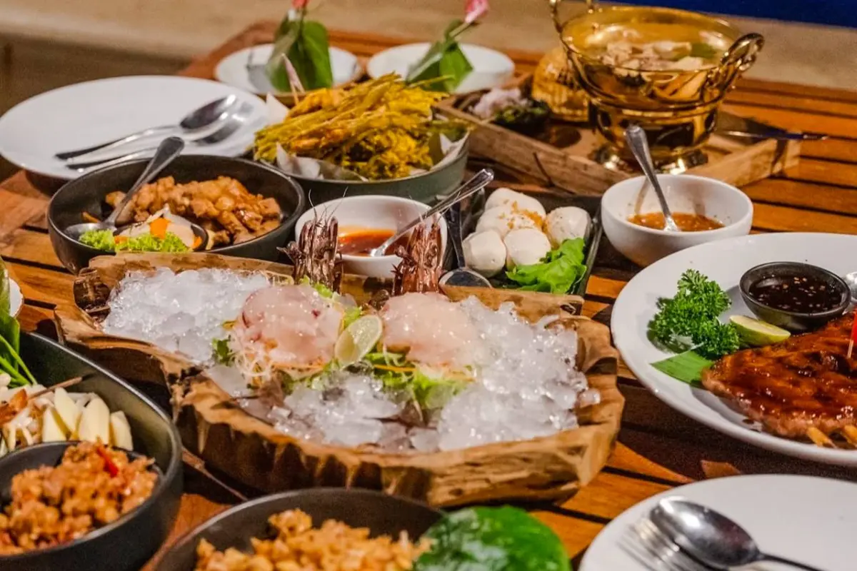Kan Eang offers a vast selection of seafood dishes, including lobsters, king prawns, fresh oysters, classic Thai and Phuket-style cuisine, exotic dishes, and desserts, as well as an extensive wine and beer list.