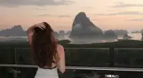 Breakfast at a café with a view of the sunrise and Phang Nga Bay.