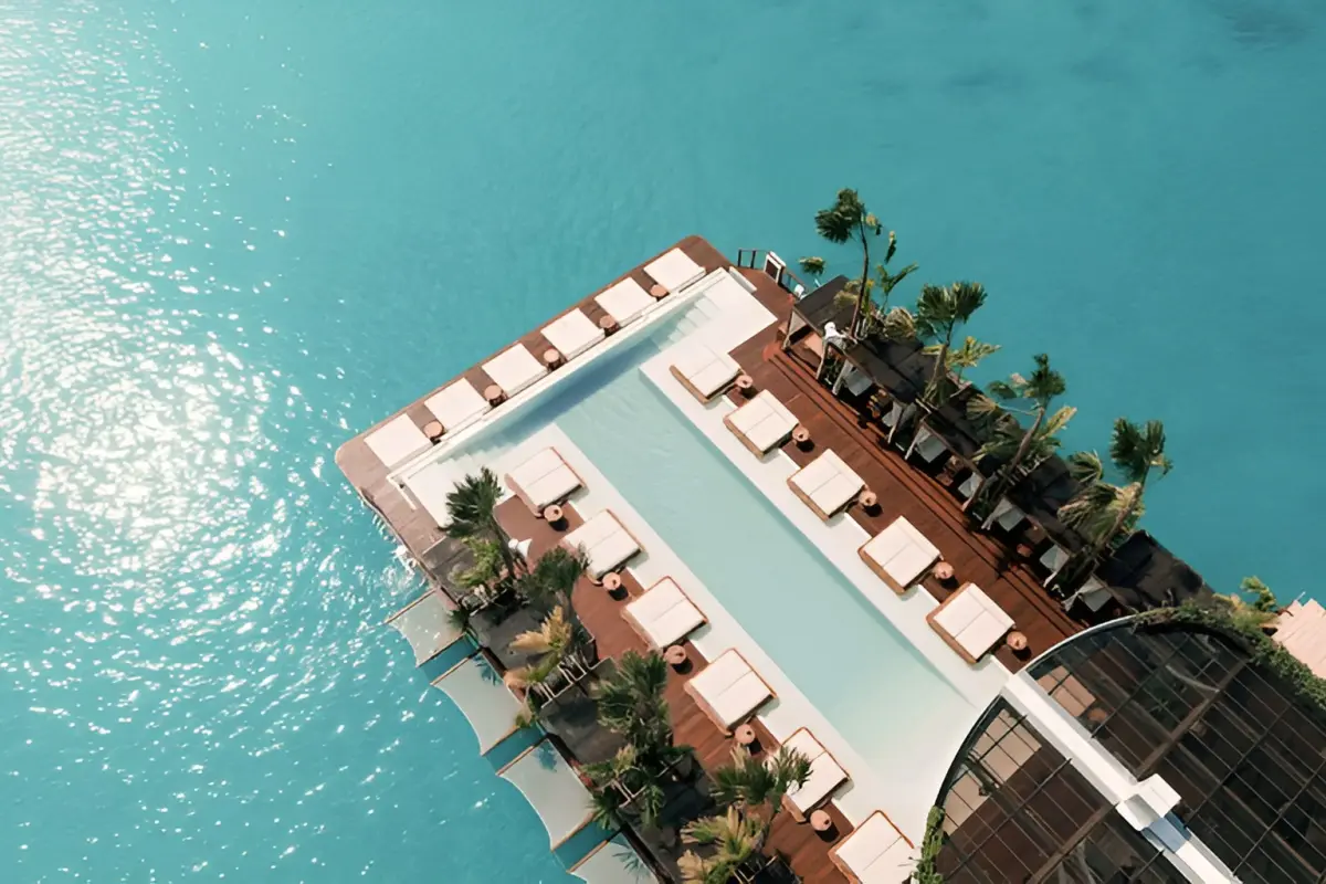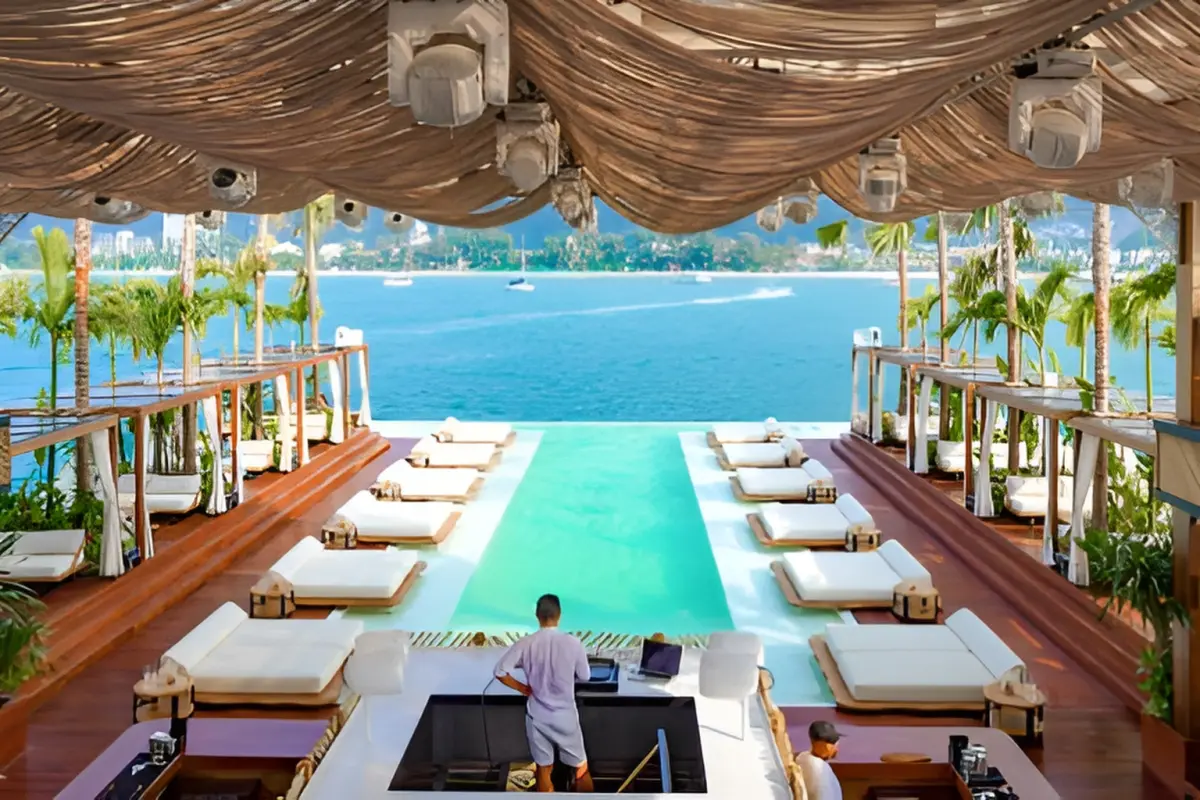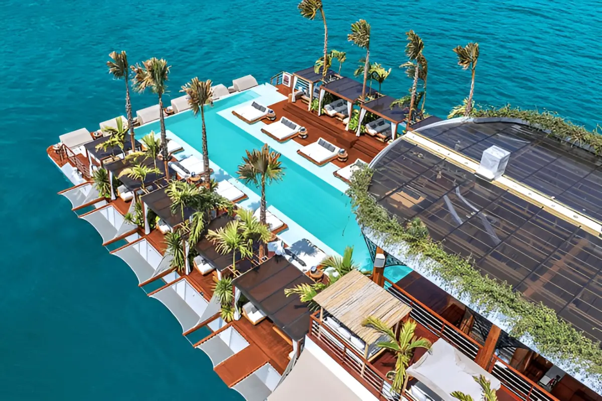 Yona Beach Club is the first floating bar in Phuket. It covers 1 200 sq.m. with three decks. In the center, there's a pool, sun loungers, and palm trees. There's a bar and DJ station. The first deck is the beach club. The second deck is a terrace. The third deck is a rooftop with cabanas. Perfect for events and celebrations.