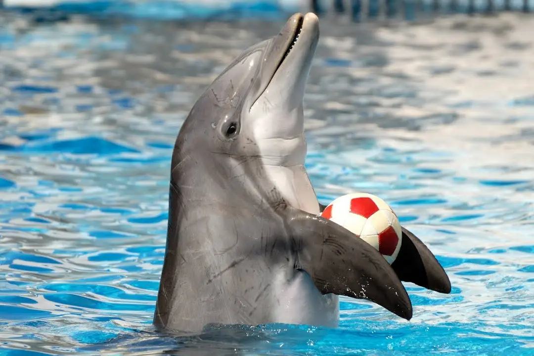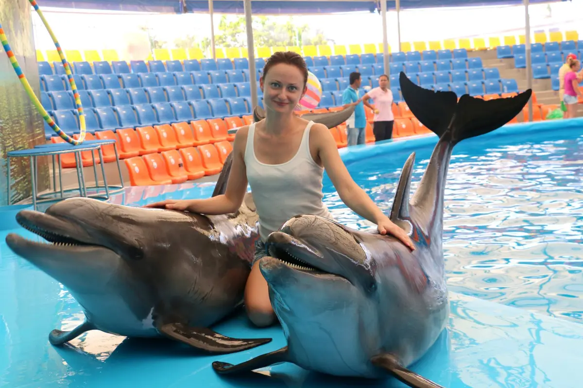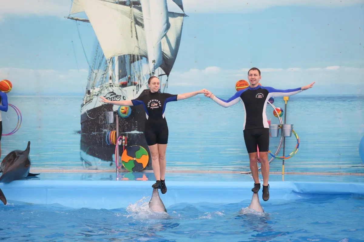 Дельфины выполняют трюки: прыжки в высоту, катание дрессировщиков, танцы и игры в воде.