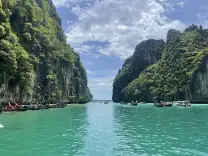 Семье из двух взрослых и двоих детей 9 и 13 лет экскурсия очень понравилась! Мы попали в группу, где кроме нас русских не было, только гид Джамиля. Отправлялись с нового порта, что было преимуществом при выборе путевки, в дождь. Организация быстрая. На завтраке в зоне встречи народу было много, отправлялись сразу две лодки по разным направлениям. Отправление без задержки, в 9:30 ложка уже отошла от пирса. Лодка представляет собой 5 рядов сидений на два человека в середине и остальные скамейки по периметру. Вместимость ~ 40-43 человека + команда. Первой точной был остров Бамбу. На наш взгляд это самая неудачна точка. Как таковой красоты нет, место для купания ограничено буйками в виде буквы П. Плавать можно только в жилетах. Смотреть в масках там просто нечего. Вода светлая слегка мутноватая, на дне песок и коряги. Побултыхались час в воде, борясь с неудобным жилетом, и возврат на лодку. Следующая остановка у основного острова Дон архипелага Пхи-Пхи не у берега, а немного на глубине для удачного снорка. Только здесь можно было увидеть рыбок, раковины, мурен и т.п. Вода чистая, плавать приятно, но остановка уже меньше часа ~40 минут. После этого лодка переезжает к берегу к так называемой пристани у отеля. Все идут на обед в ресторан, где накрыт небольшой шведский стол, но на перекус достаточно. Я лично долго там не сидела, отправилась купаться справа от парковки лодок у отельных бунгало, растянутых вдоль пляжа. Вода приятная, на дне песок. С маской делать нечего, а поплавать в удовольствие. На обед выделяют час, потом мы переехали в бухту Майя Бей, где снимался фильм Пляж с Ди Каприо. Остановка на 50 минут, но купаться нельзя - запрещено. Народу для фотографий очень много. Фото без людей можно сделать в правой дальней части пляжа, куда идёт минимум народу. Видели трех малышек акул, плавающих в бухте, на них показывал смотритель пляжа. Ноги можно намочить только по щиколотку. И последняя точка в лагуне, где предлагают за доплату пересесть в деревянные лодки и прокатиться по лагуне. Сей финт ушами нами не был поддержан, так как основная лодка паркуется в лагуне, где можно и нужно свободно купаться. Мне лично здесь понравилось больше всего. После выхода из лагуны смотрим на пещеру викингов, где собирают слюни ласточек 🤪 Где-то по дороге ещё показывают с берега обезьянок, сидящих на прибрежных скалах. Выйти и подойти к ним нельзя. Как итог: посещение острова Бамбу было излишне, ни удовольствия от купания, ни фото тут не получите, лучше бы подольше стояли на других локациях. Поездка по времени долгая, старт в 9:30, мы вернулись в Марину в 17:20. Трансфер оценить не можем, так как по ехали сами на авто. Всем удачи и удовольствия от П(х)укета )))