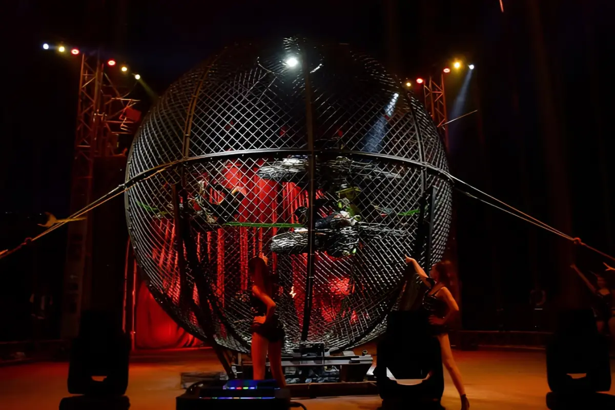 Байкеры внутри стального шара - головокружительные трюки на пределе возможностей.