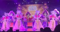 Яркие карнавальные наряды артистов с большим количеством страз, блесток и перьев.